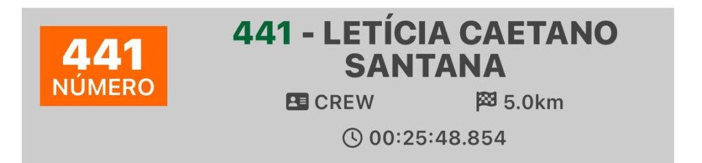 A corredora completou os 5 km da prova em 24 minutos e 21 segundos, registrando seu terceiro melhor tempo na distância, e com o cronômetro marcando 25:50, garantiu o segundo lugar geral feminino externo, resultado que emocionou amigos, familiares e admiradores que acompanharam sua trajetória.